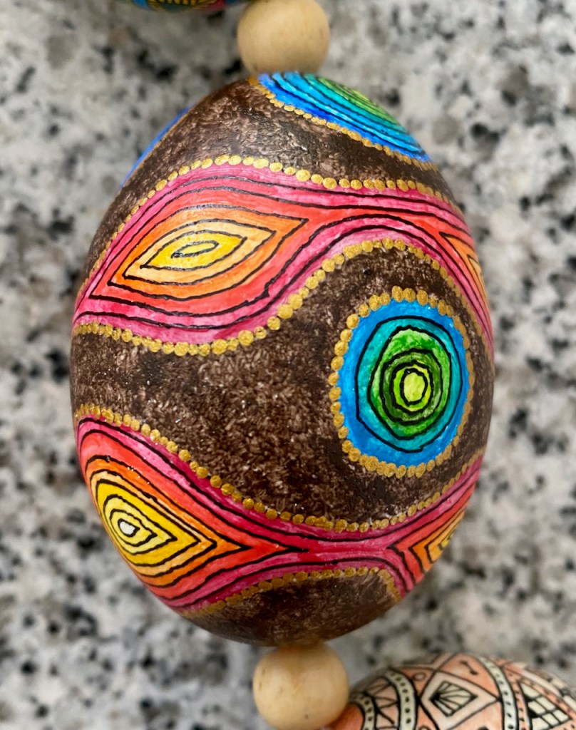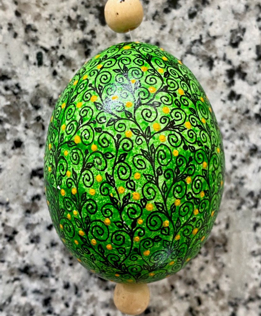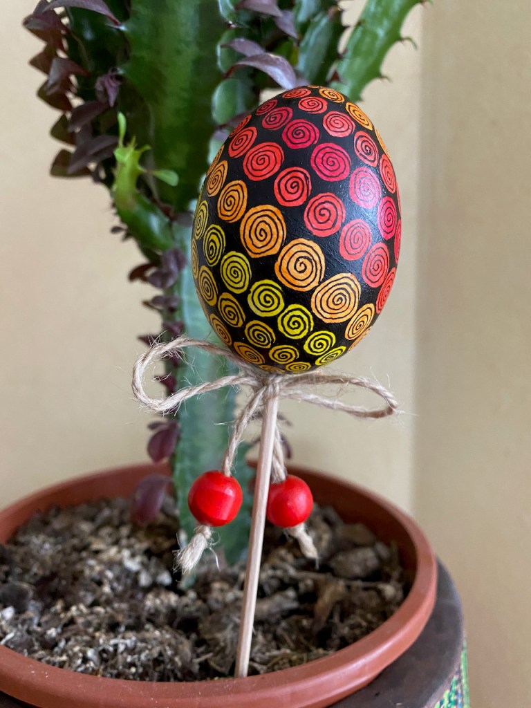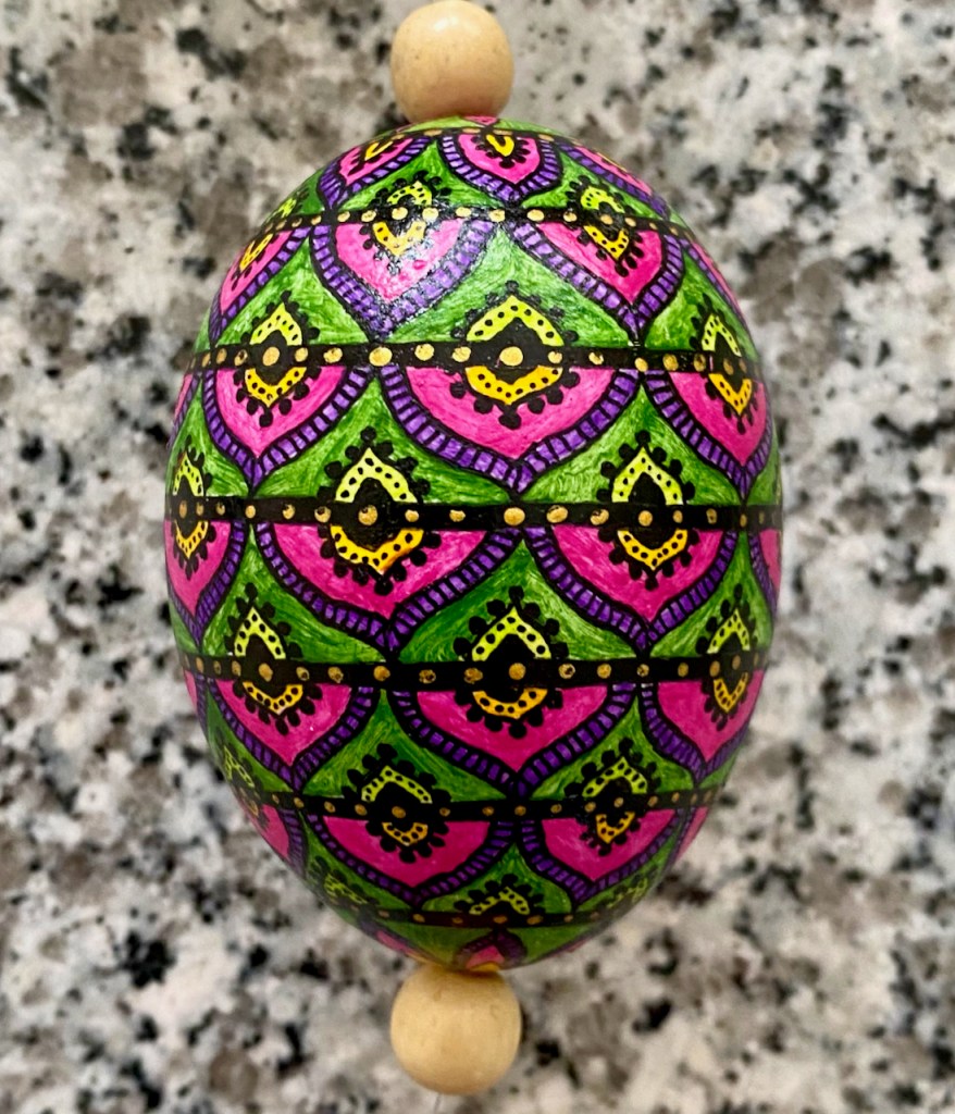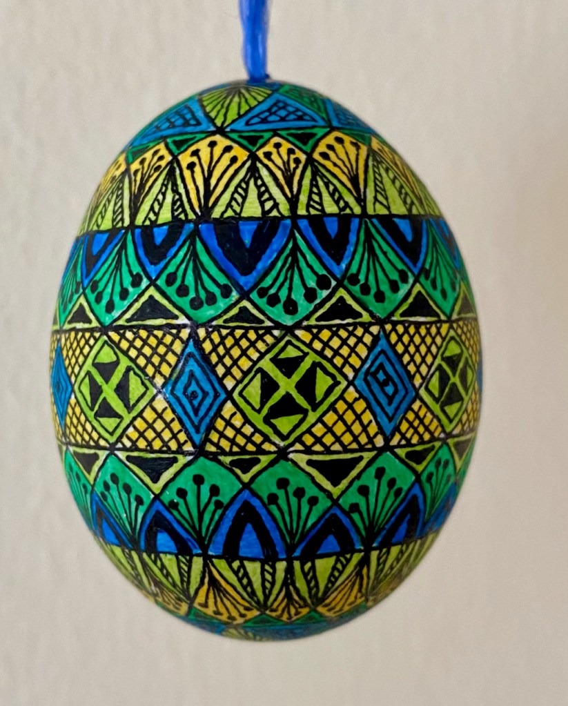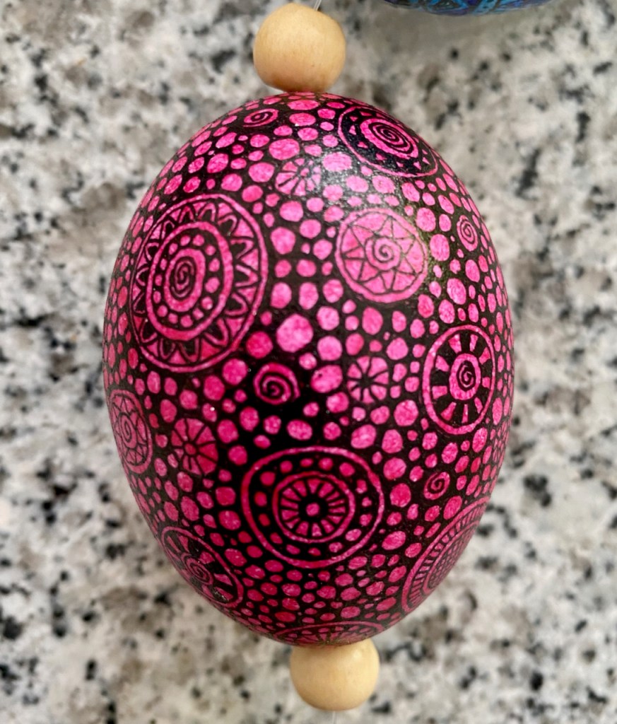 Die Maltechnik, die ich am Anfang für die Eier benutzt habe, hatte ich ja schon zu Genüge auf Papier geübt. Bei jedem Ei, das ich bemalt habe, kamen mir neue Ideen, und so wurden es an die 50 Stück
