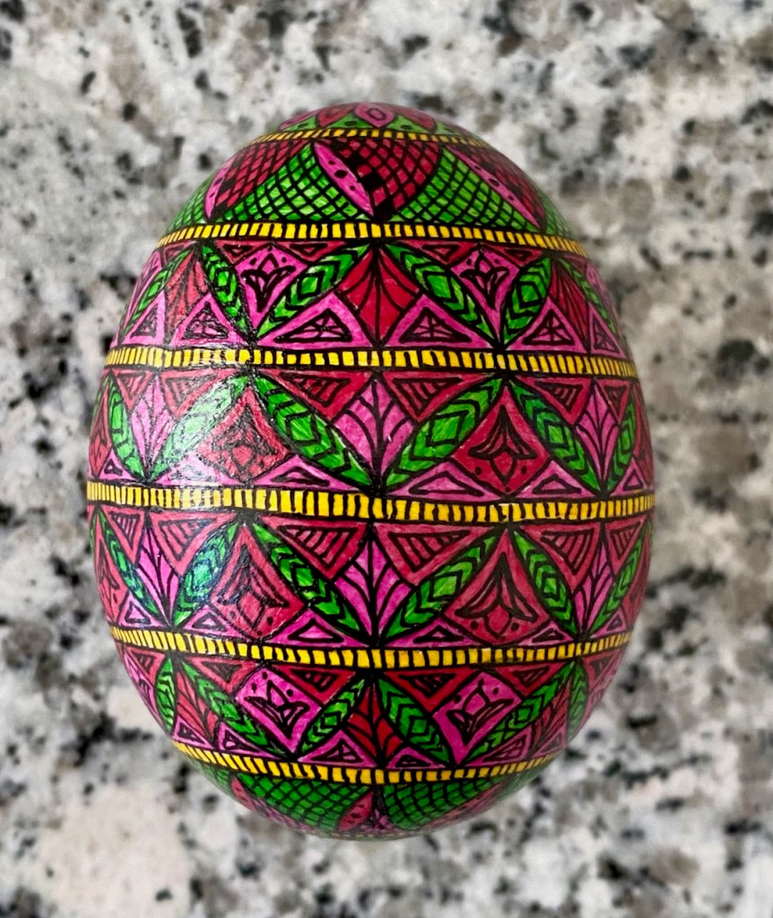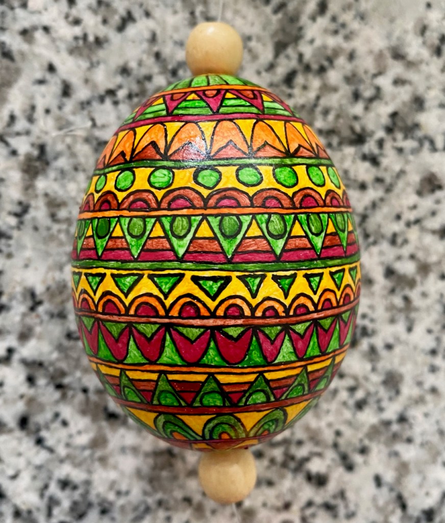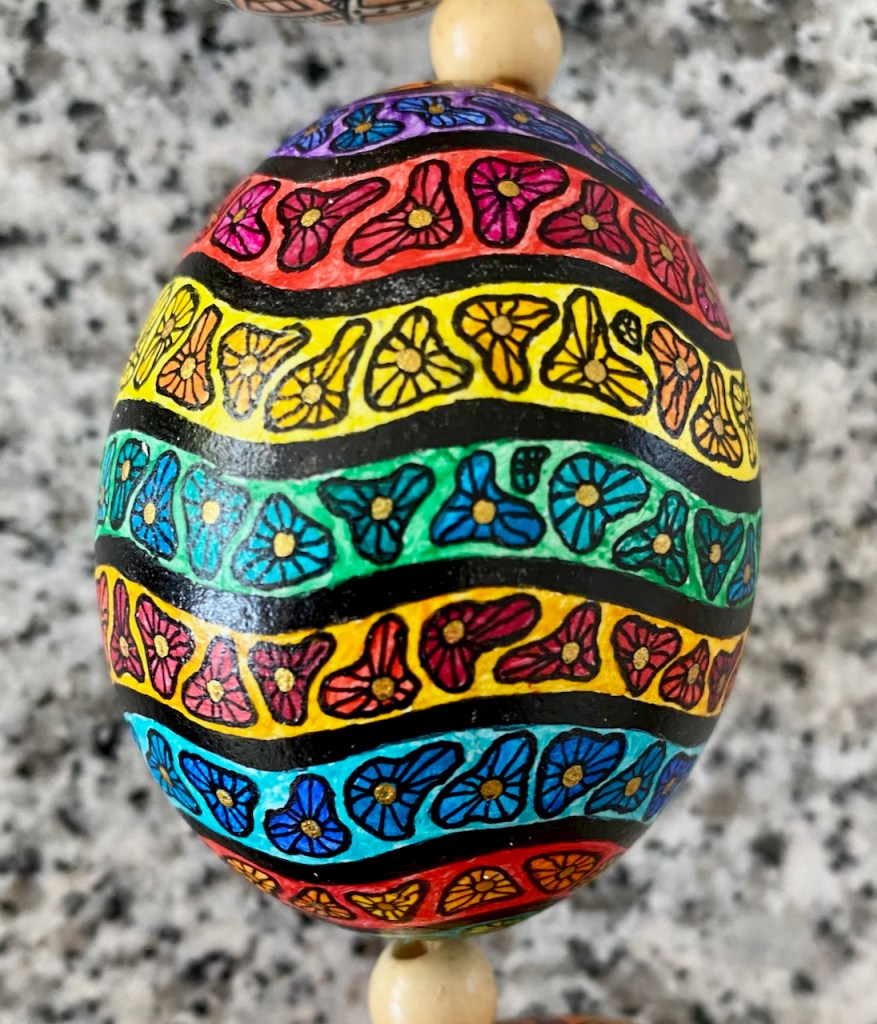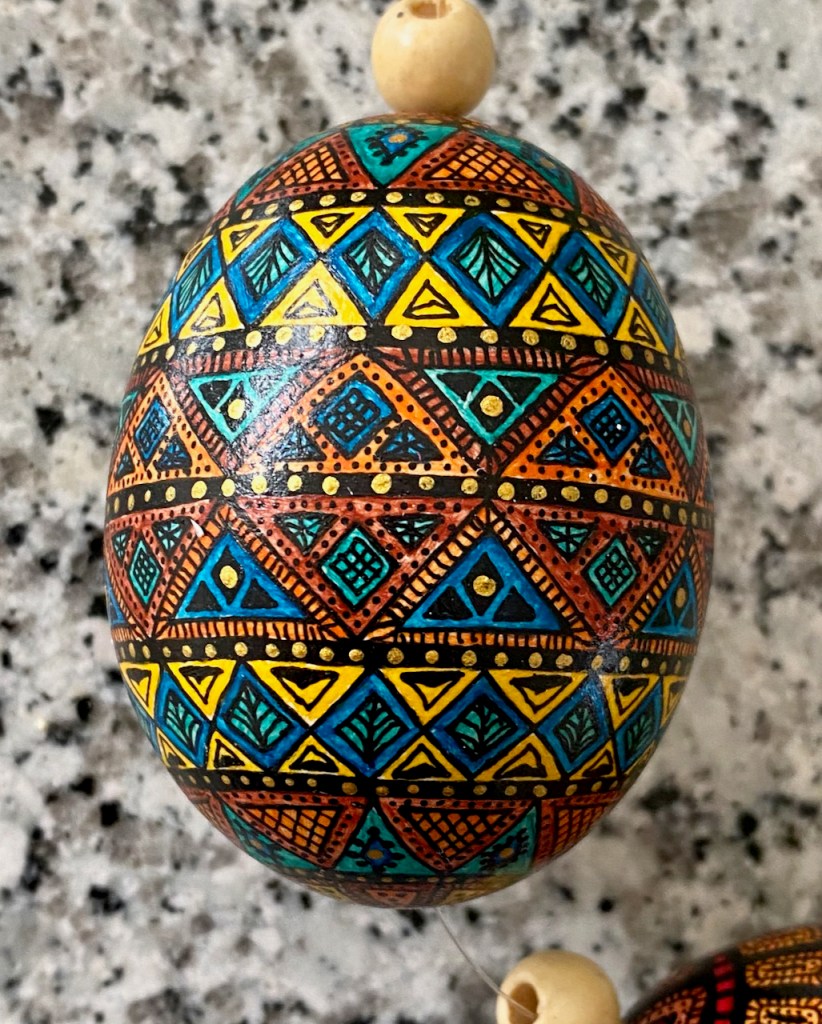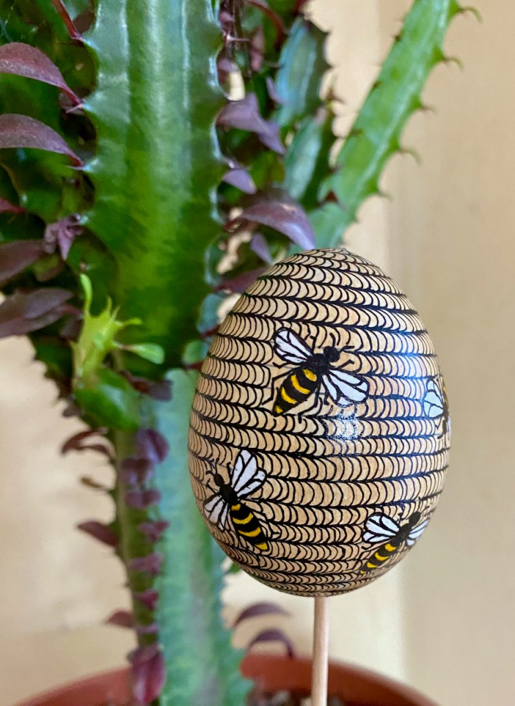 Die Maltechnik, die ich am Anfang für die Eier benutzt habe, hatte ich ja schon zu Genüge auf Papier geübt. Bei jedem Ei, das ich bemalt habe, kamen mir neue Ideen, und so wurden es an die 50 Stück