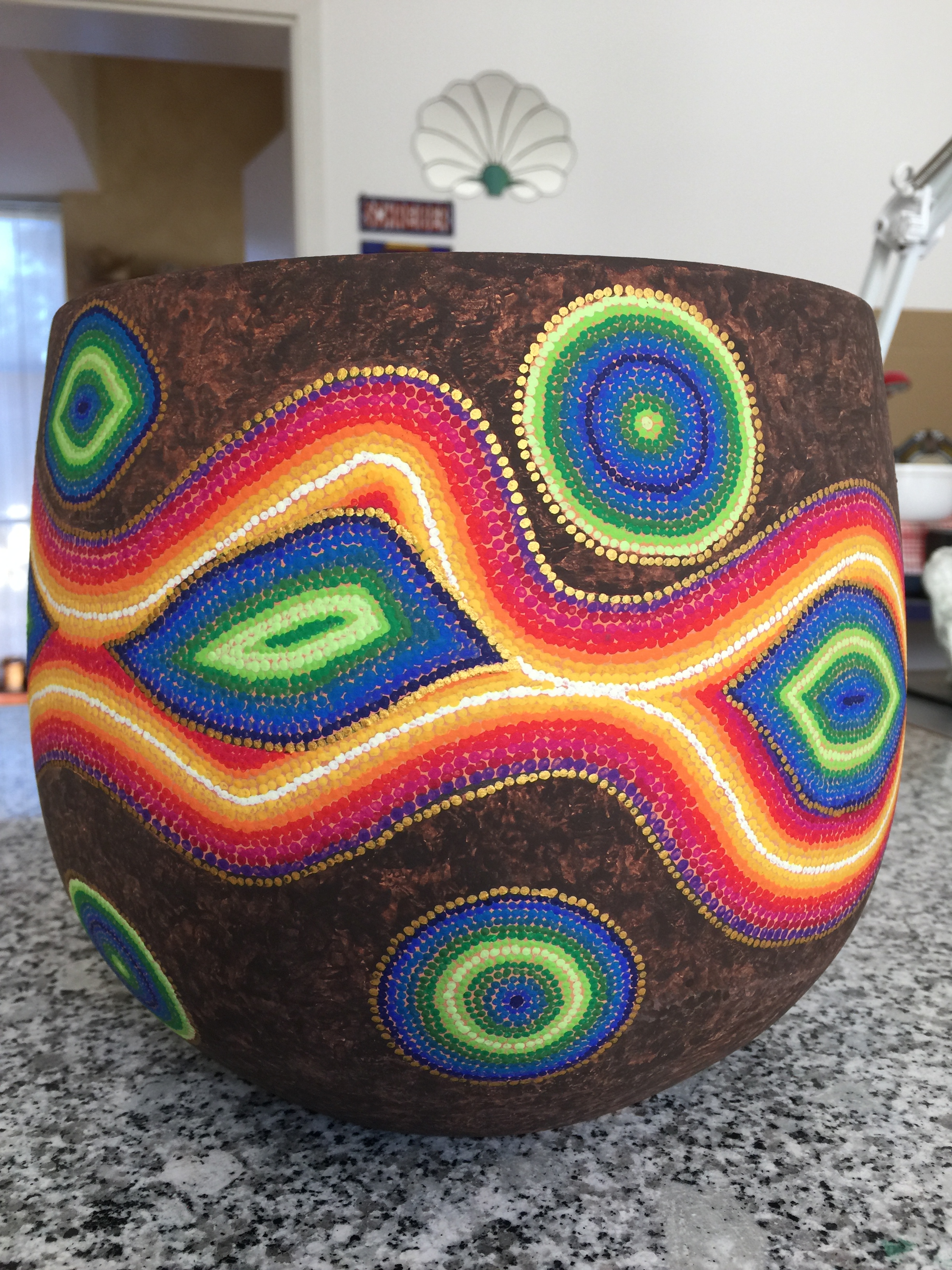 Im Mai 2020 sind Acrylfarben in mein Atelier eingezogen. Diese Art von Farbe eignet sich hervorragend für Pünktchen. Ich habe mit kleinen Blumentöpfen aus Ton angefangen, und mit der Zeit wurden die Erfahrung und Töpfe immer größer. Die Punkte habe ich mit Zahnstocher oder Schaschlikspiesse aufgetragen. Ich höre immer „Was für eine Arbeit!“ und „Du hast ja Geduld“. Ich verstehe es, aber für mich ist das keine Arbeit, eher entspannend und meditativ.